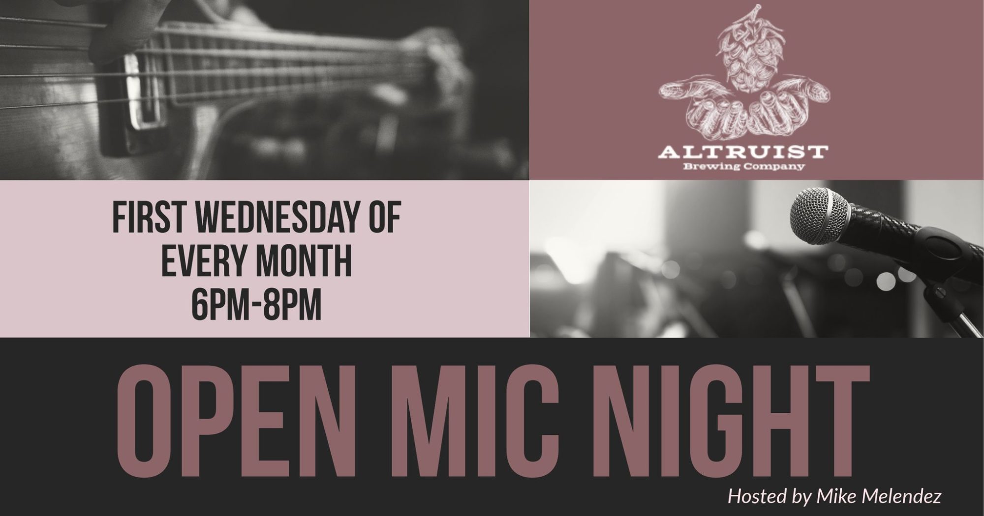 Altruist Brewing Company presents Open Mic Night hosted by Mike Melendez, the first Wednesday of every month, 6:00 PM to 8:00 PM. Bring your own instruments, songs, performances, jokes, etc!...