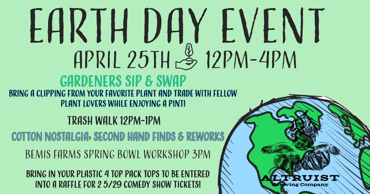 Celebrate Earth Day with us here in the taproom! Gardeners Sip & Swap: Bring a clipping from your favorite plant to swap with other plant lovers while sipping on a pint, 12pm-4pm Trash Walk, 12pm-1pm Cotton Nostalgia Reworked Clothing & Accessories Pop-up, 12pm-4pm Bemis Farms Spring Bowl Workshop, 3pm - Tickets available through Bemis Farms